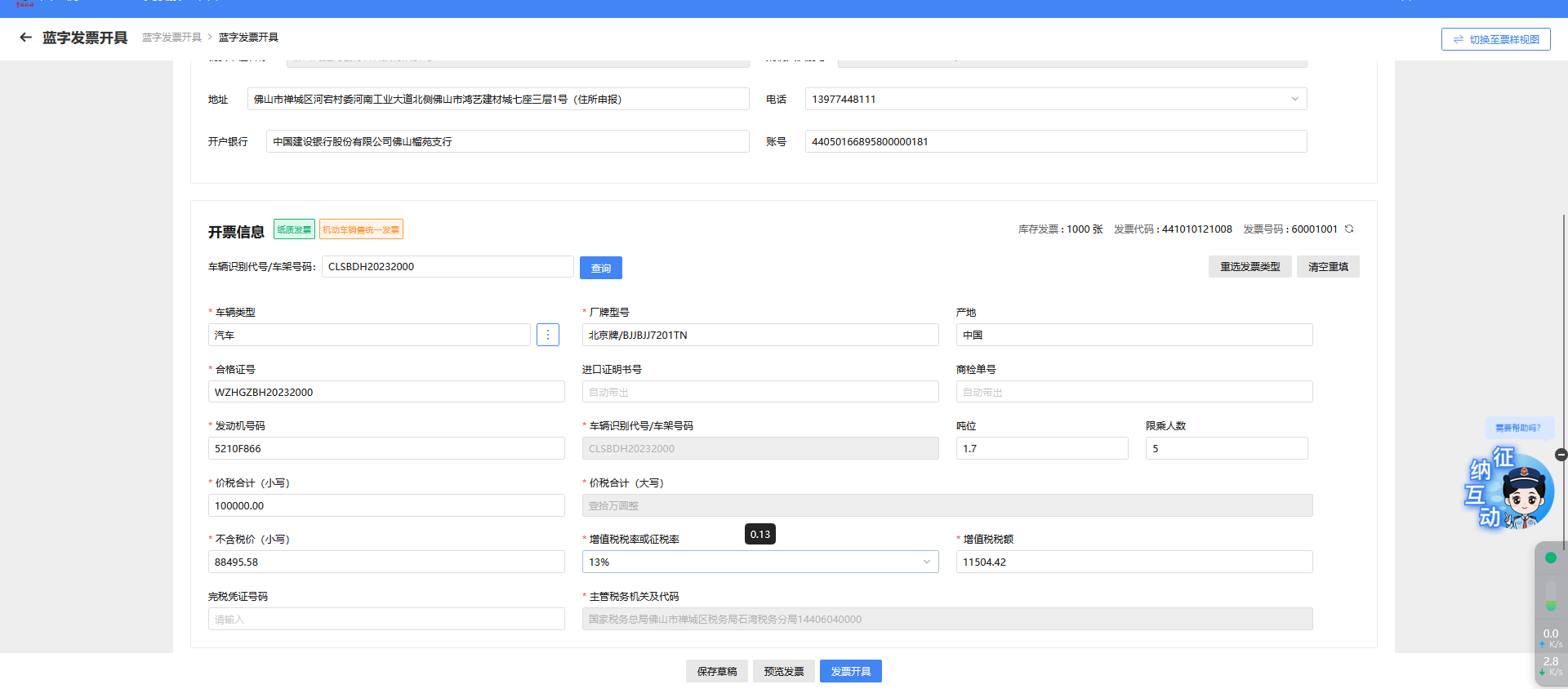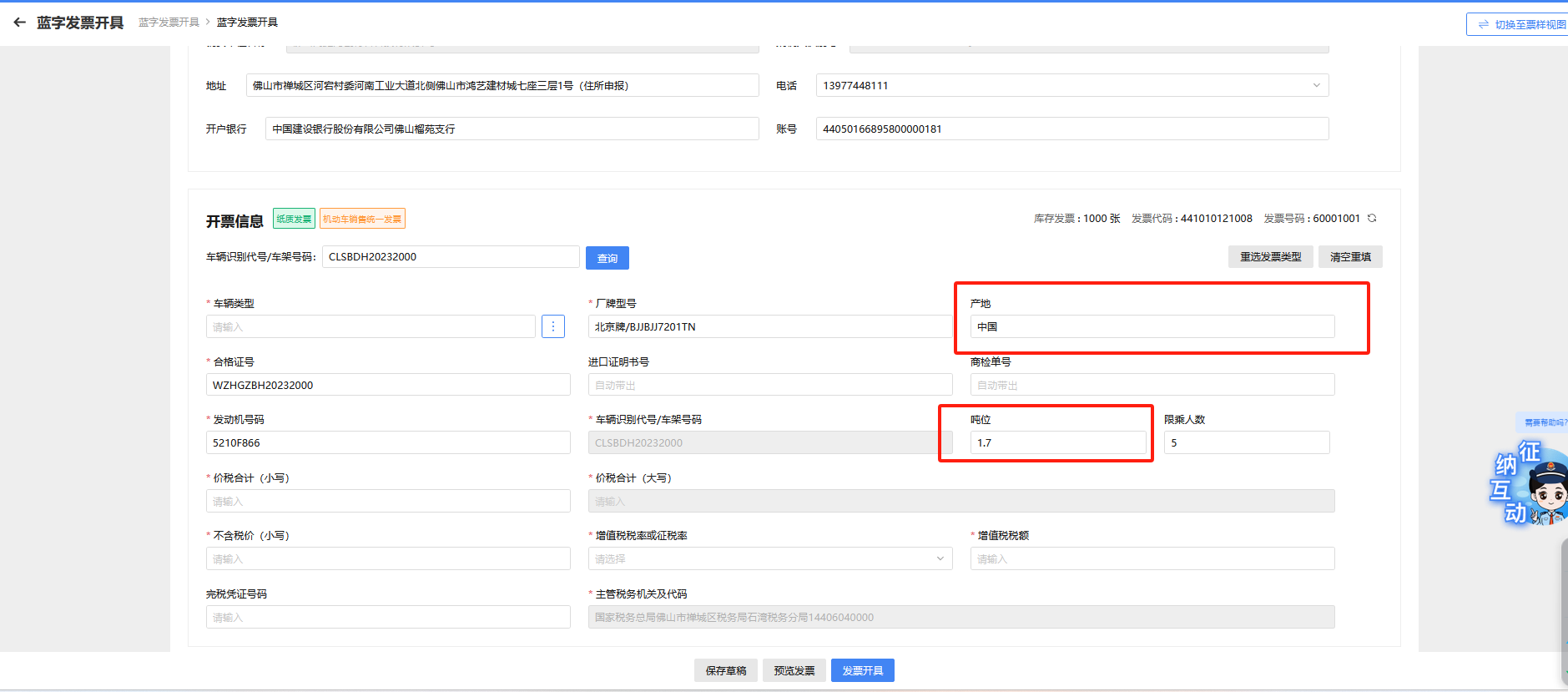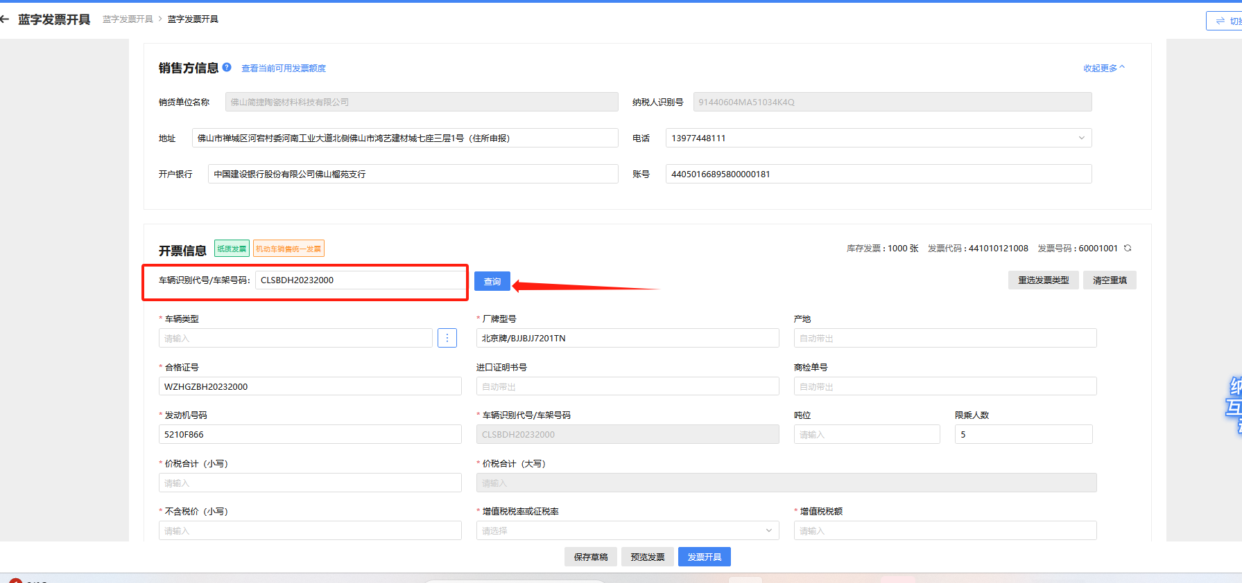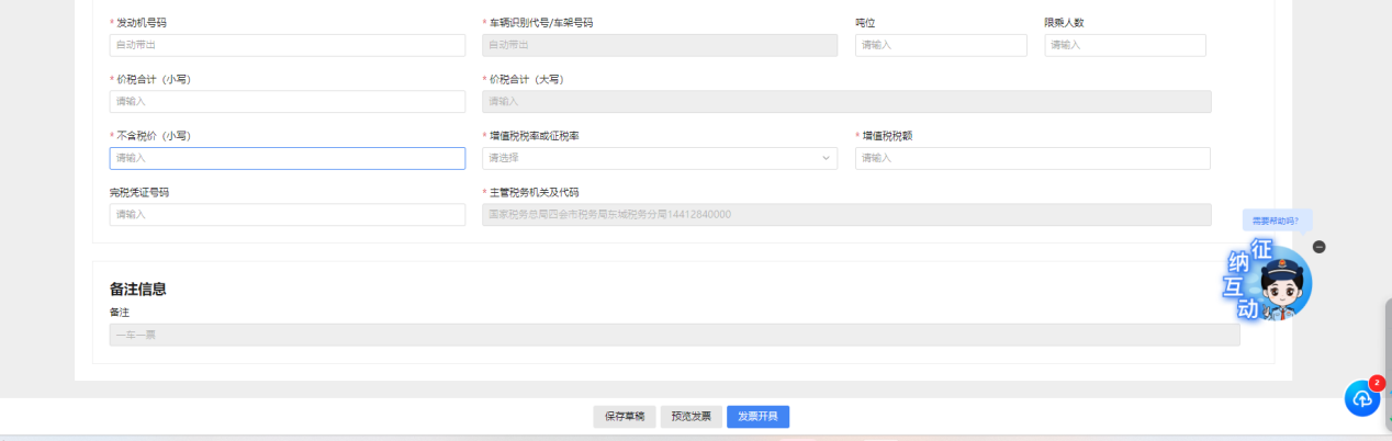 车辆类型仅可选择机动车类商编,开票信息中部分字段查询车辆识别代号车架号码后会依据车辆合格证信息自动填列,无需手工填列。“备注信息”默认为“一车一票”不可更改。