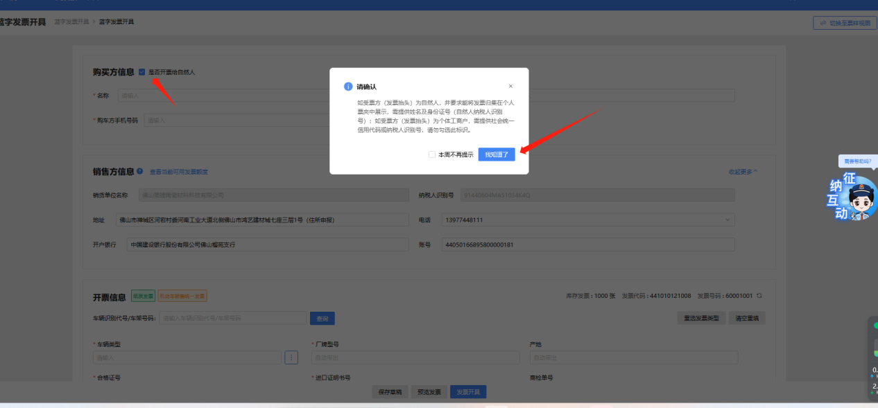 ⑦纳税人按实际情况正确如实填写购买方信息、销售方信息、开票信息,其中当购买方为自然人时,需勾选“是否开票给自然人”复选框,系统自动弹窗提示,点击“我知道了”,按实际业务填写自然人名称及身份证件号码,如图 8所示;当购买方非自然人时,不可勾选“是否开票给自然人”复选框,按实际情况填写购买方信息,如图 9所示。