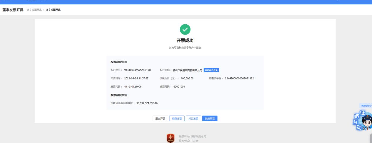 ⑩点击“发票开具”,系统进行自动校验,校验无误发票开具成功,自动交付至对方数字账户,如图 13所示。需要说明的是,若对方为自然人勾选了“是否开票给自然人”复选框填写了正确无误的身份证件号码后系统会自动交付至购买人个人票夹。