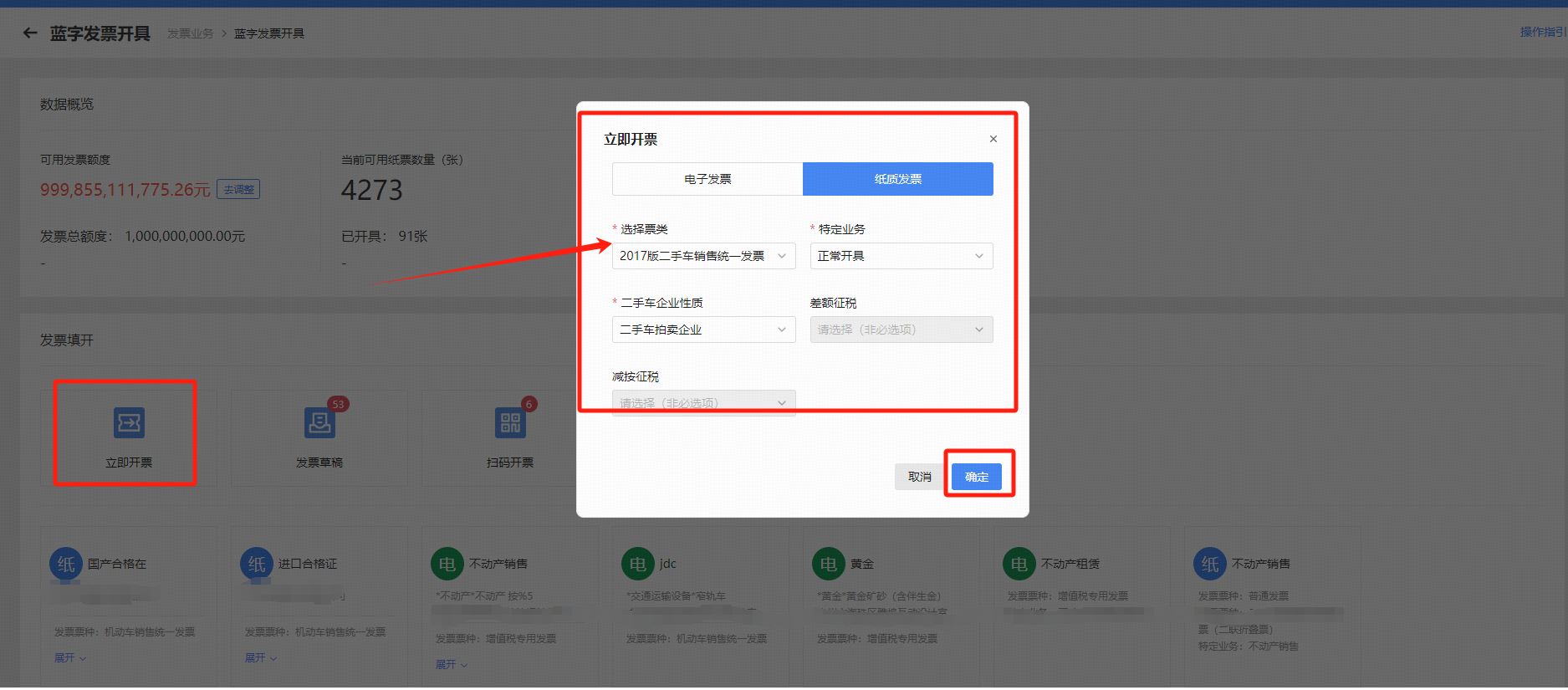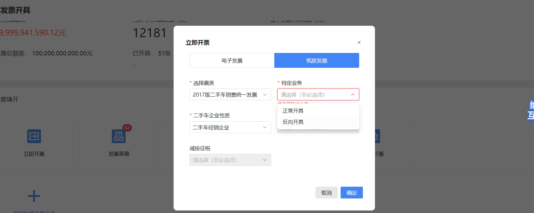 ②点击【立即开票】,选择纸质发票,发票类型选择“二手车销售统一发票”,特定业务选择“正常开具”,二手车企业性质根据开票企业实际情况选择,如图2所示。若二手车企业性质为经销企业,特定业务下拉列表增加“反向开具”选项,如图3所示。