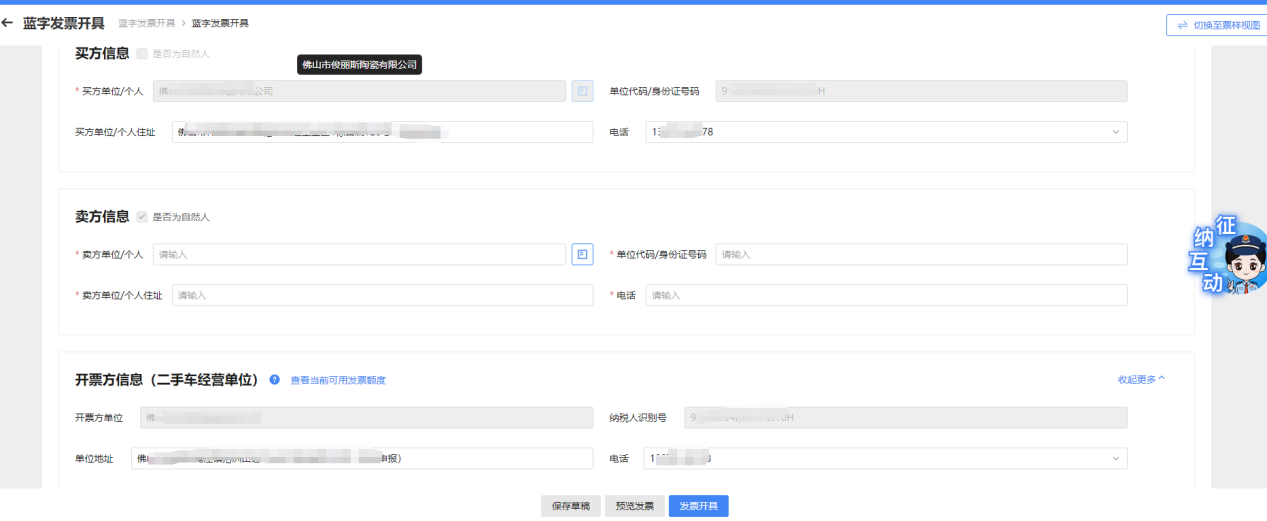 ③点击【确定】,进入发票填开界面,纳税人填入实际发生业务的买方信息、卖方信息,确认开票方信息。如图 4所示。反向开具页面买方信息栏自动填充为开票方信息且不允许修改,如图 5所示。