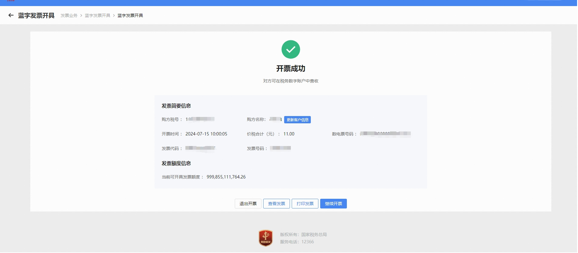 ⑤发票开具成功,界面展示发票简要信息,如图 7所示。