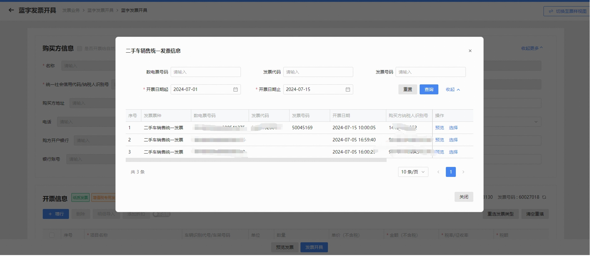 ③点击【确定】,在弹出的界面中,选择本次换开增值税专用发票所关联的二手车销售统一发票,在右侧点击“选择”,如图 3所示。