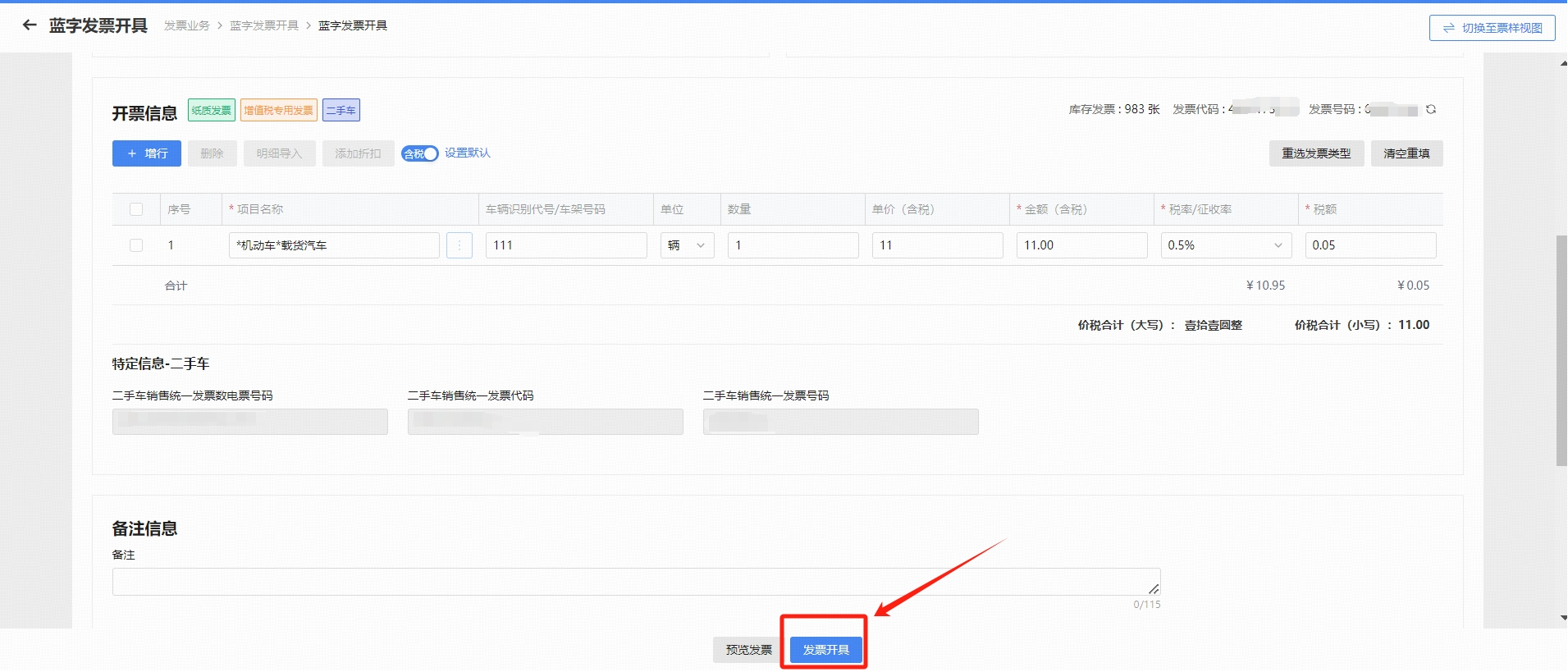 ④进入发票填开界面,系统将根据关联的二手车销售统一发票自动带入购买方信息、销售方信息、开票信息、展示关联的二手车销售统一发票信息,确认内容后,点击【发票开具】,如图 4、图 5所示。