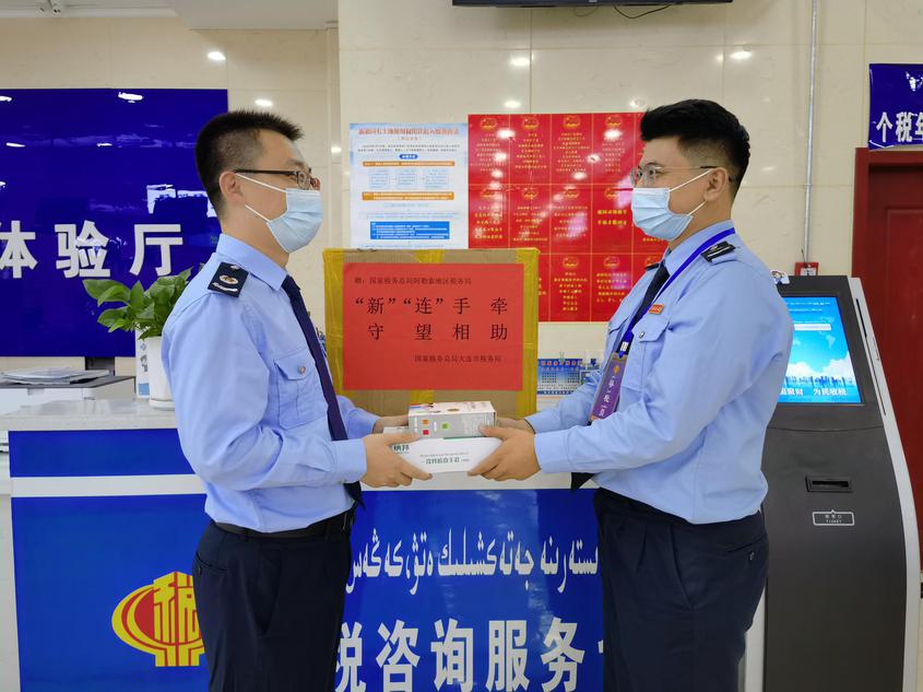 大连市税务系统援疆干部刘源向办税服务厅人员发放防疫物资。李保英