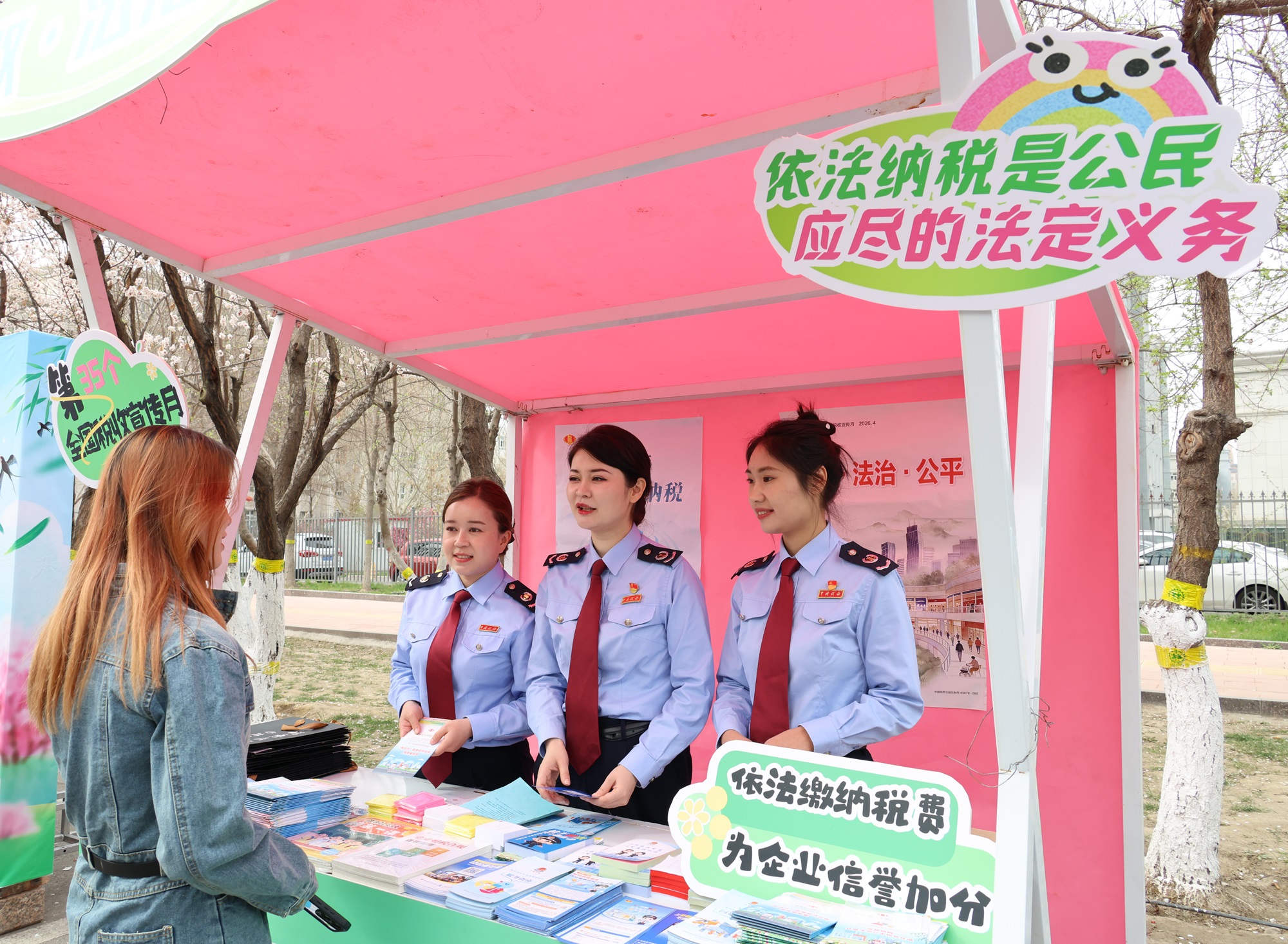 国家税务总局伊犁哈萨克自治州税务局在伊宁市海棠路设立“税收•法治•公平”普法站,邀请周边商户和市民进行互动问答,普及税法知识,解读热点政策,提升合规意识。