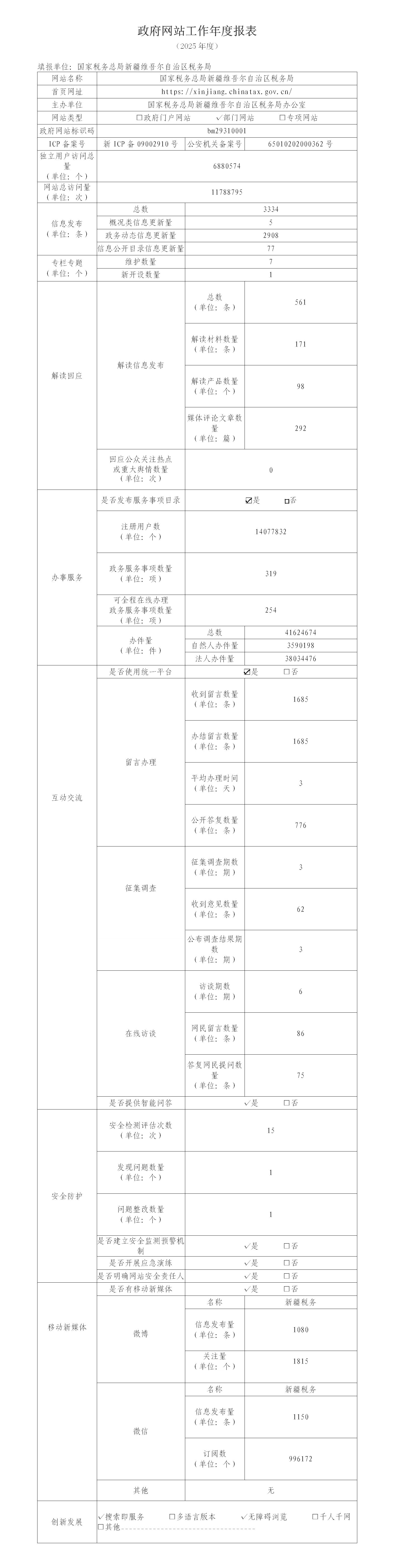 2025年国家税务总局新疆维吾尔自治区税务局政府网站工作年度报表
